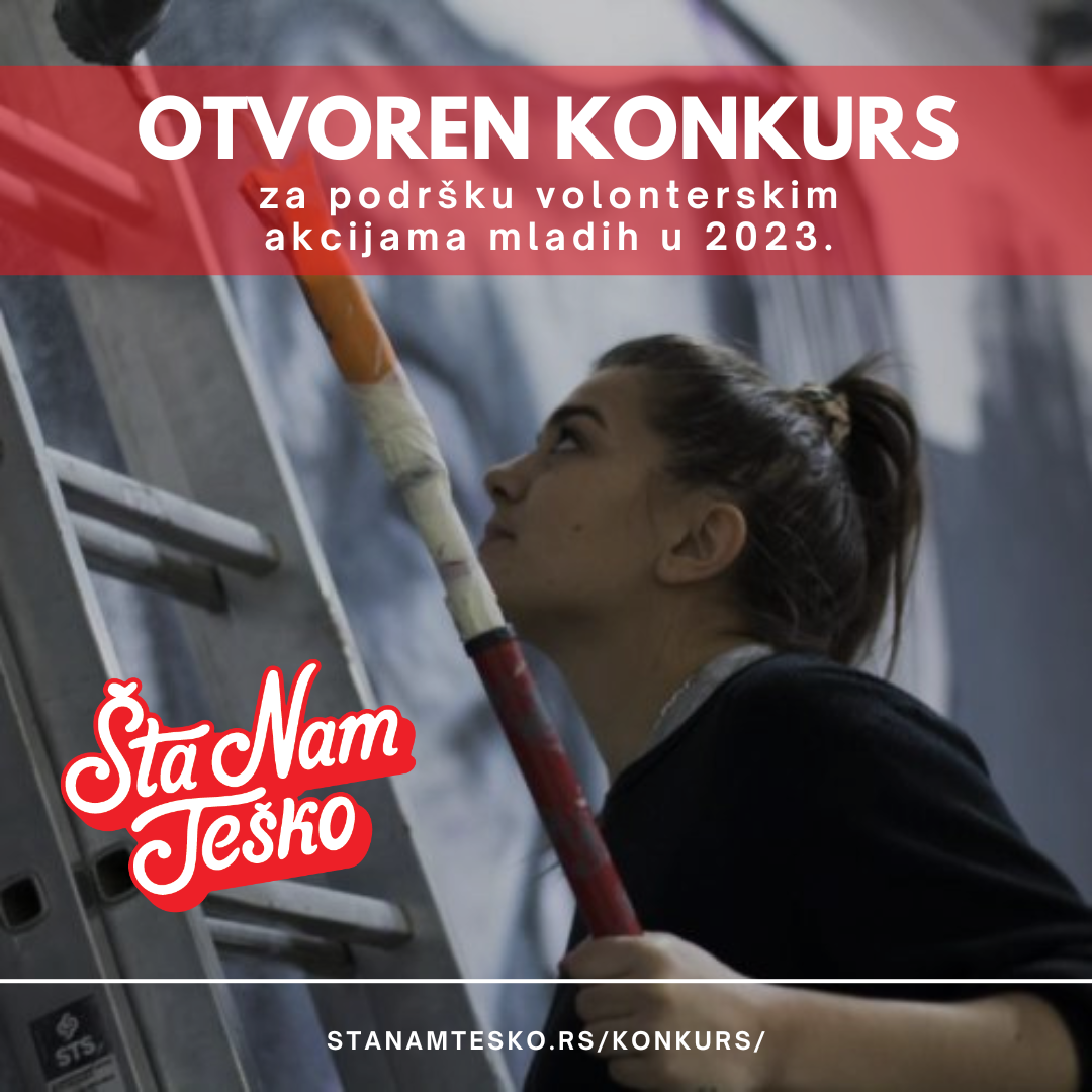 Ove godine i ti možeš da se sa svojim drugarima organizuješ i da uradiš nešto korisno u svom mestu – konkurs za finansiranje i podršku ideja mladih (od 15 do 30) godina pod nazivom “Šta nam teško” je sada otvoren. Grupe od najmanje 5 mladih osoba mogu da se prijave na konkurs, i dobiju podršku da sprovedu neku svoju ideju u lokalnoj zajednici.