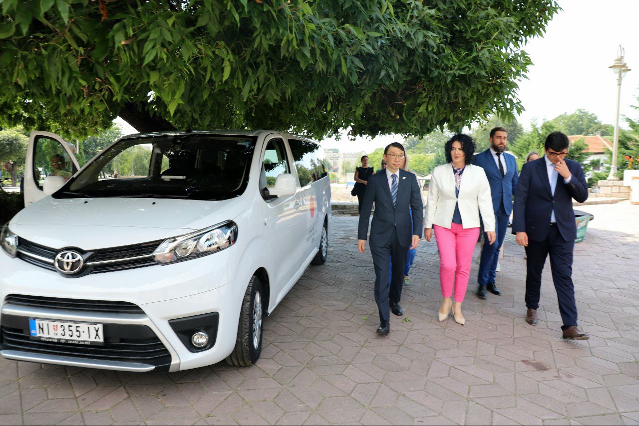 Gradonačelnica Niša Dragana Sotirovski i ambasador Japana u Srbiji Akira Imamura kome je ovo prva poseta Nišu na samom početku njegovog mandata, uručili su ključeve vozila za osobe sa invaliditetom predsedniku Udruženja invalida rada grada Niša Milošu Stojkoviću.